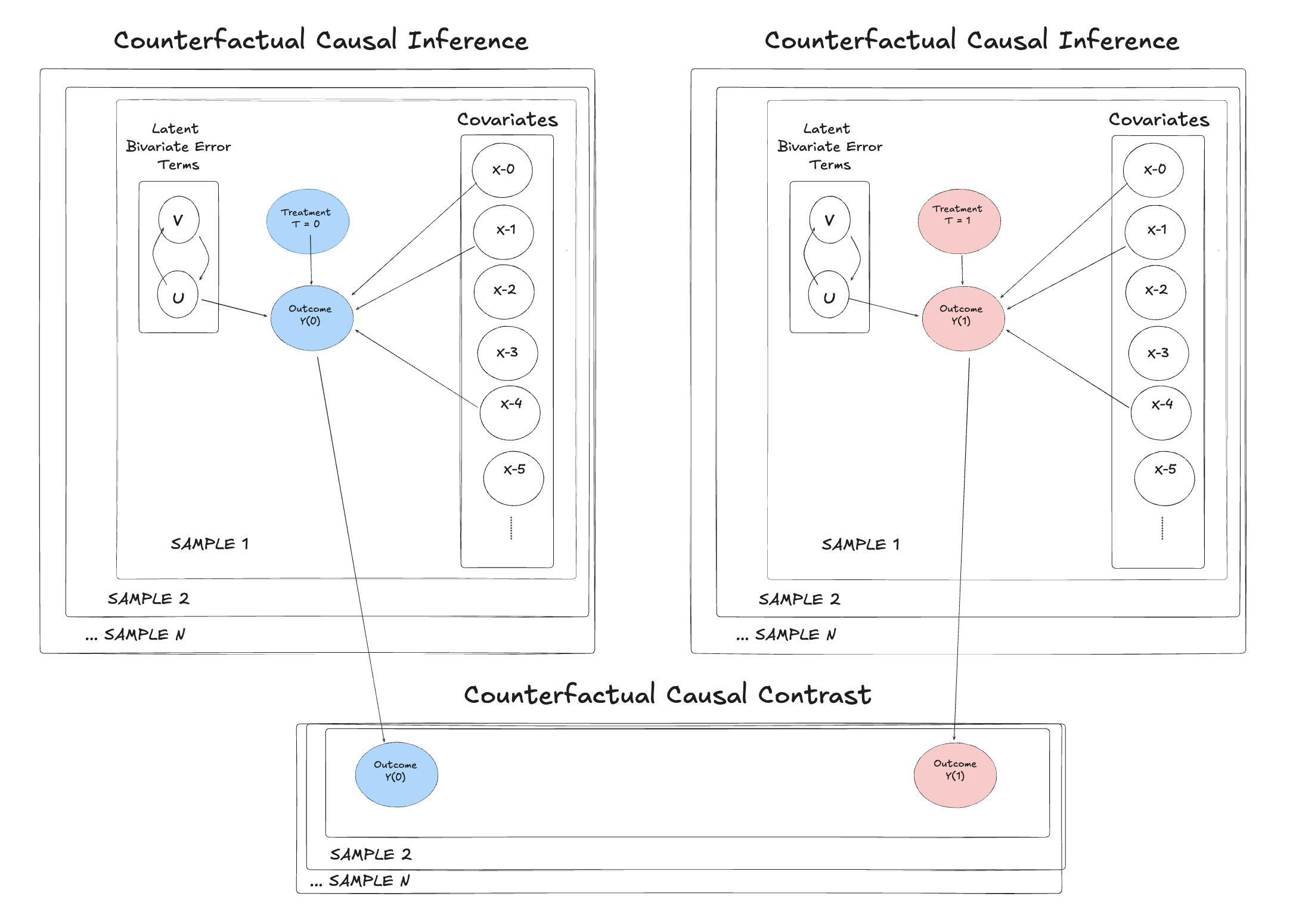 This is a two step move in the Bayesian paradigm. First we infer “backwards” what is the most plausible state of the world \(w\) conditioned on the observable data X, T, O. The “world” of the model is defined by: (1) a causal graph relating variables, (2) likelihood functions specifying how each variable depends on its causes, and (3) prior distributions over parameters. Optionally, this may include latent confounders, measurement models, and selection mechanisms—each adding structural detail but also complexity. With this world \(w = \{ \alpha, \beta_{1}, \beta_{2} ... \}\) in place, we continue to assess the probabilistic predictive distribution of treatment and outcome at the plausible range of counterfactual worlds.